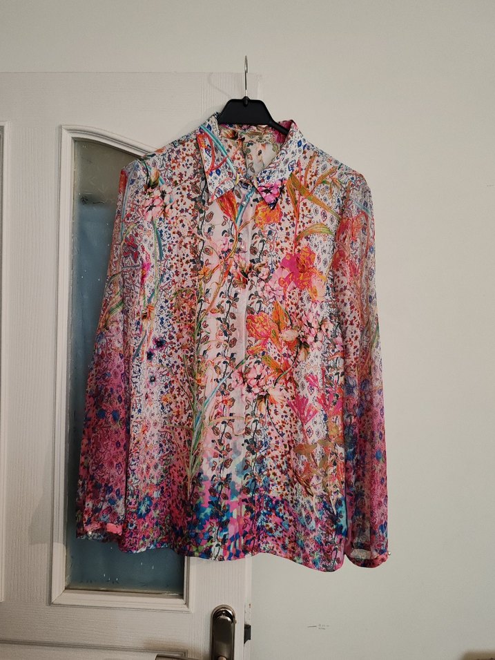 Bohem tarzda, inci düğmeli, yakalı, uzun kollu ve bol kesim gömlek, pastel çok renkli deseniyle. Göğüs ölçüsü 54, sırtında küçük plikaşe var. M beden ama 40. 42.44 giyebilir. Yurt dışından geldi, bedeni iç göstermez, kolları şifon gibi biraz gösteriyor.