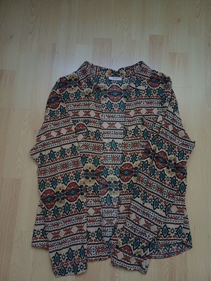 Bohem tarzda, koyu çok renkli desenli, uzun kollu ve normal boy gömlek. Tekneli tekstil malzemeden, günlük kullanım için uygun.