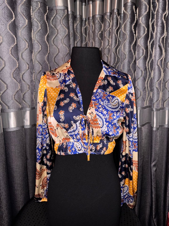 Bu dar kesim bohem mini bluz, uzun kollu, V yakalı ve kemerli bel detayına sahiptir. Parlak çok renkli tie-dye desenli sentetik kumaştan üretilmiştir ve günlük kullanıma uygundur.
