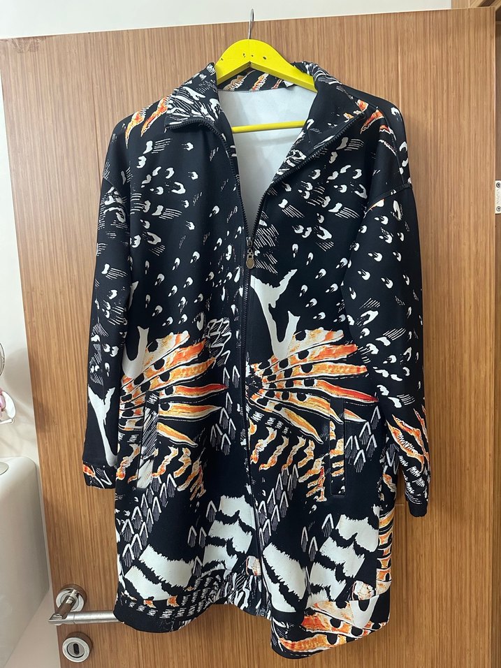 Bol kesim, uzun kollu, feemuarlı sweat.Yumuşak sentetik kumaşta koyu, çok renkli bohem desenli, günlük kullanıma uygun.