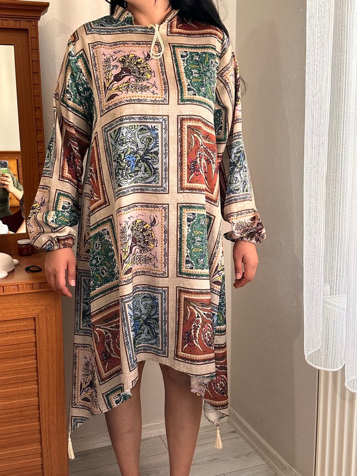 Bol kesim, yüksek yakalı ve bağcıklı bohem tunik. Uzun kollu, çok renkli baskılı ve dökümlü yapısı günlük kullanım için uygundur. - iki omuz arası 40,5 -iki koltuk altı arası 55 - orta kısım boy 100 - yandan uzun kısımları 113 - bel 65