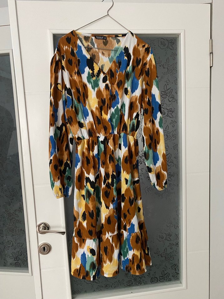 Hafif çok renkli batik desenli, sentetik kumaştan bol kesim uzun kollu uzun elbise. Drapeli tasarım ve V yakaya sahiptir, bohem stil için uygundur.