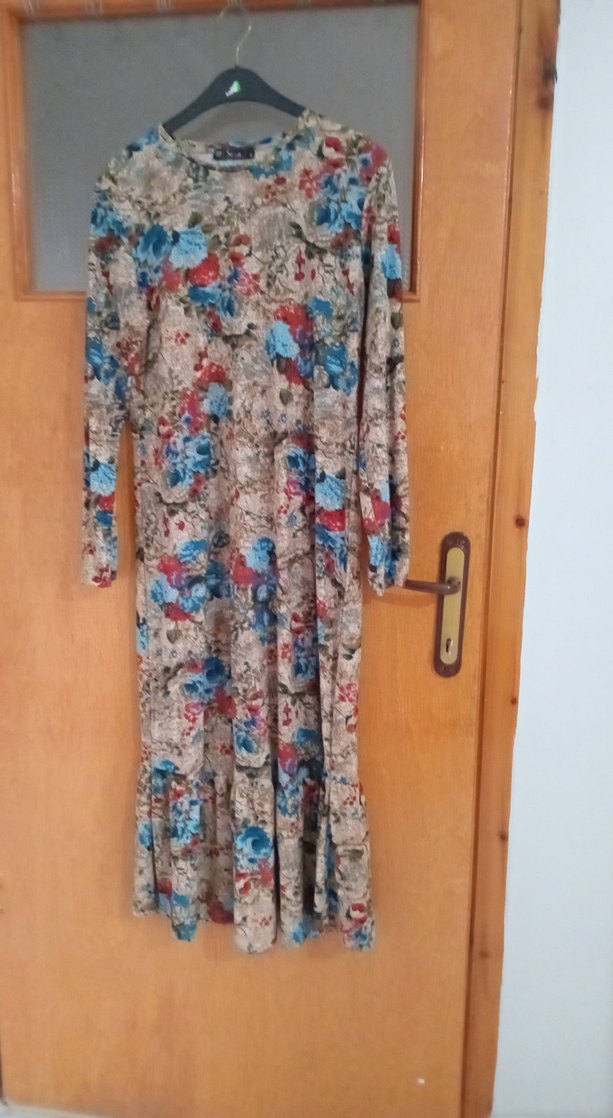 Bohem tarzı uzun kollu, yüksek yakalı, bol kesim elbise. Sentetik kumaştan, çok renkli batik desenli ve fırfırlı, günlük kullanıma uygun. çok az kullandım yeni ve yumuşak kumaşı var bana gelmediği için satiyorum