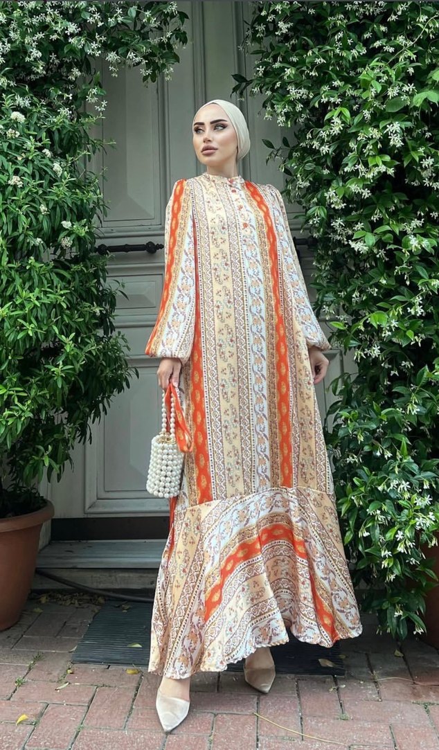 Bohem tarzda, bol kesim, drapeli ve uzun kollu çok renkli, hafif tie-dye desenli, sentetik kumaştan uzun elbise. Yüksek yakalı ve günlük kullanım için uygun.