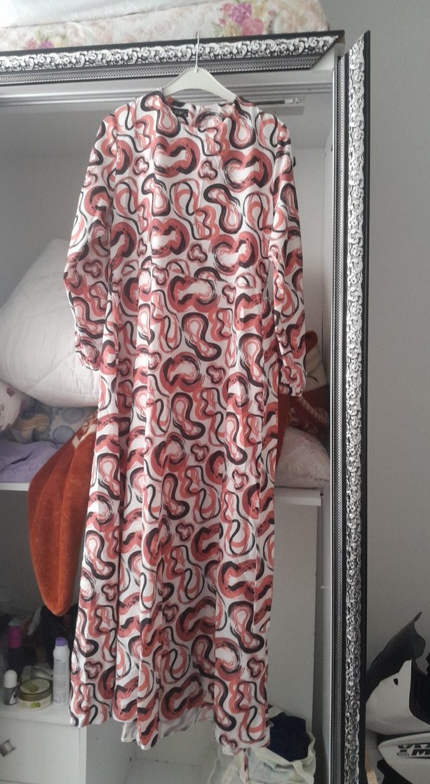 Bohem tarzda, bol kesim ve drapeli, tekne yaka çok renkli batik desenli uzun kollu uzun elbise. Günlük kullanım için uygundur.