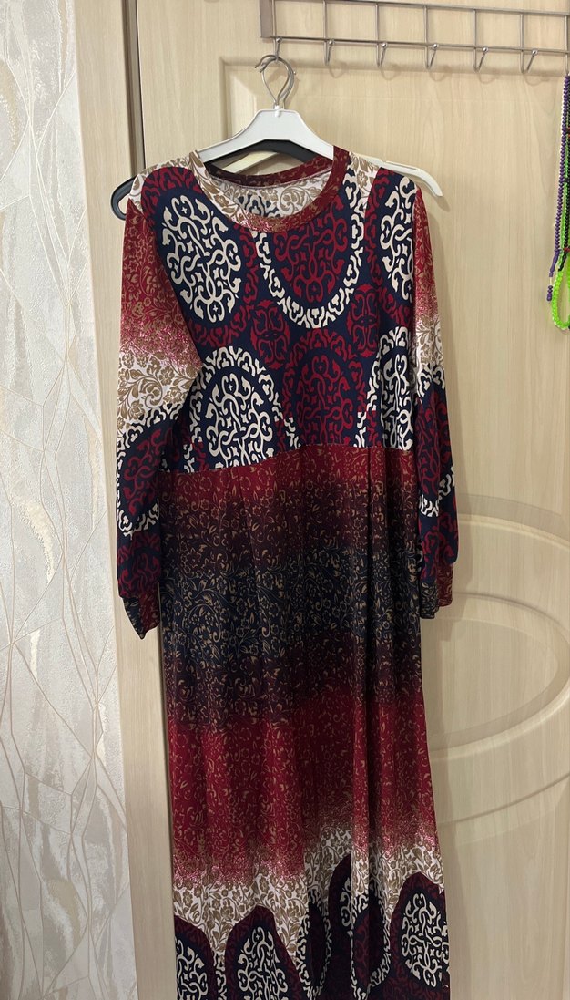 Bohem tarzda, uzun kollu ve yuvarlak yakalı, bol kesim çok renkli uzun elbise. Sentetik kumaştan, günlük kullanıma uygun, dökümlü tasarım.