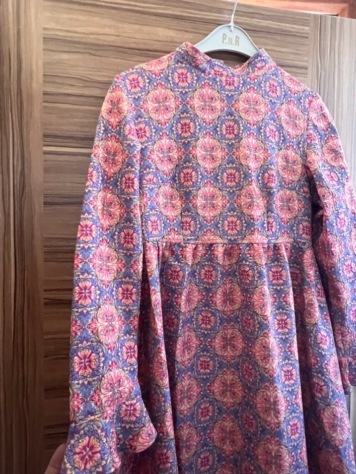 Bohem tarzda, yüksek yakalı ve uzun kollu, fırfırlı detaylı uzun elbise. Gevşek kesim ve pastel çok renkli batik desenli, yumuşak kumaştan yapılmıştır.