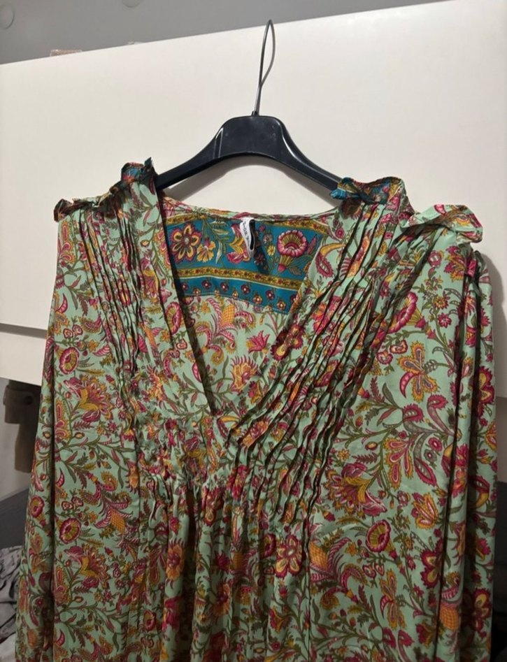 V yaka, uzun kollu, bol kesim bu uzun elbise çok renkli baskılı kumaştan yapılmıştır. Günlük kullanım için uygundur.