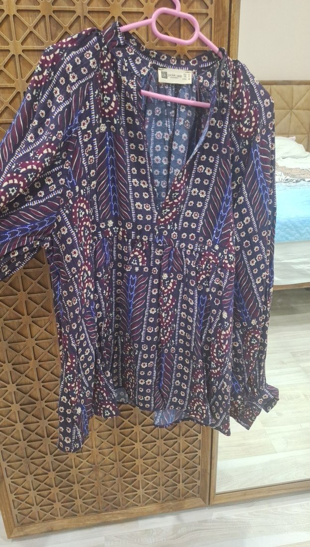 Bohem tarzı, çok renkli bağlama desenli, uzun kollu ve V yakalı bol kesim tunik. Düğmeli ve uzun boylu, günlük kullanıma uygun.