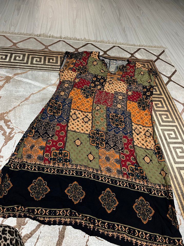 Kadınlar için bohem çok renkli desenli, uzun, kolsuz, bol kesim elbise. Kayık yaka ve drapeli detaylara sahiptir, günlük kullanım için uygundur.
