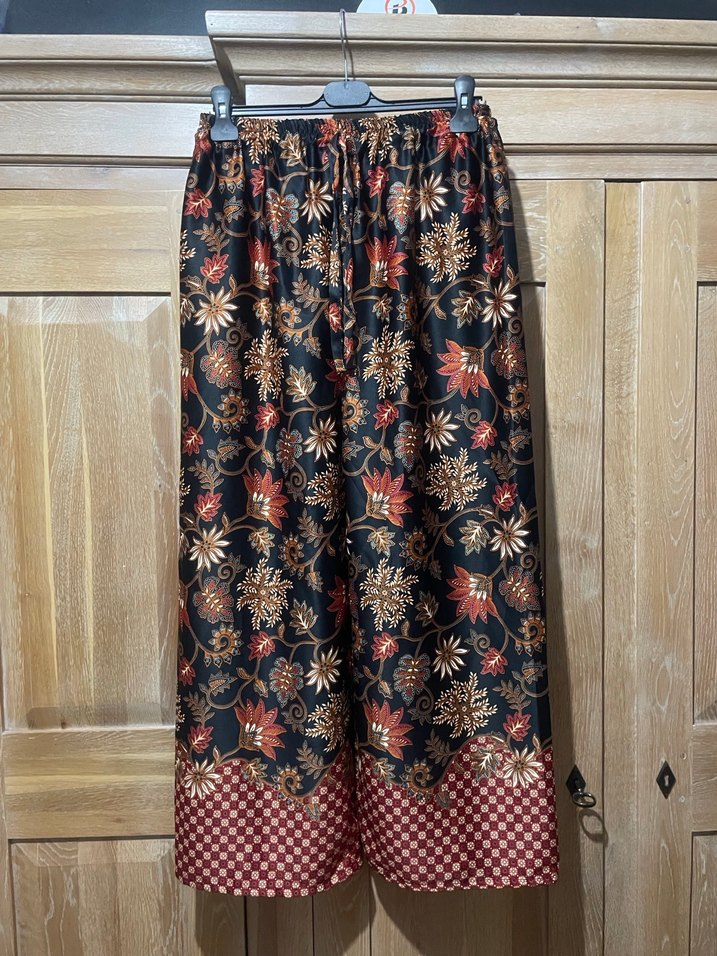 Bol kesim, uzun kadın kumaş pantolon. Koyu çok renkli bohem çiçek desenli ve drapeli. Günlük kullanım için uygun. Hindistan pamuk saten bel lastikli 70 santim esneme payı var tek ebat ürün boy 100 santim