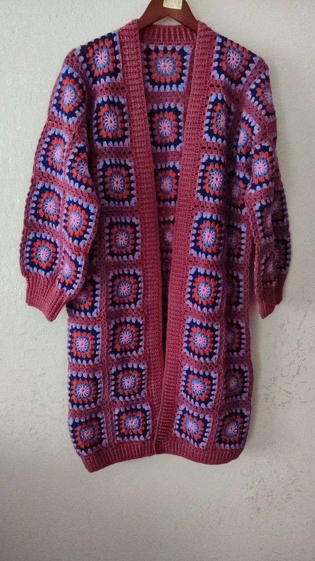 Uzun, bol kesim, çok renkli örgü desenli, yakası kesik ve uzun kollu bohem tarzda hırka.