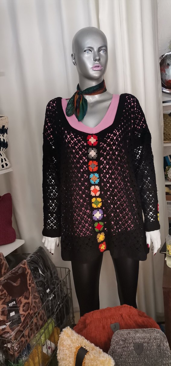 Bohem tarzında, V yakalı, uzun kollu, çok renkli desenli, bol kesim örgü kazak. Günlük kullanım için uygundur. ajurlu. dükkanında satıyorum. sıfır yapılmış ürün 38/46 beden uyumlu