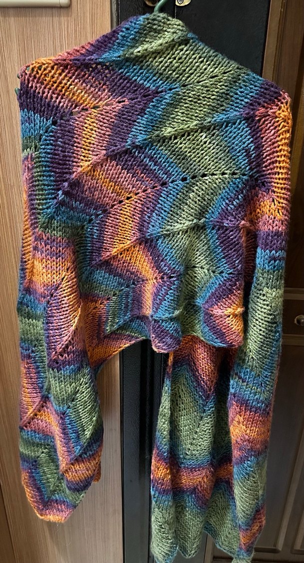 Bu şal kendi el emeğimdir.bir kere kullandım, parlak çok renkli batik desenli, bol kesim ve uzun boyda kendisinden karışık renkli örgü şal.