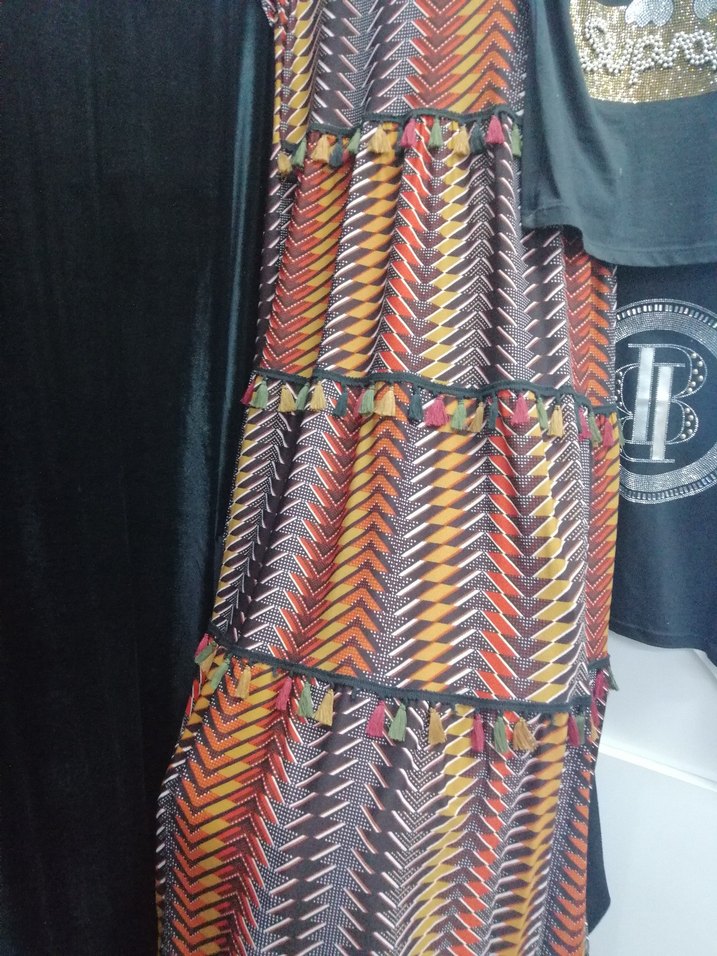 Bohem tarzda, çok renkli ve koyu tonlarda pilili uzun etek. Gevşek kesimi ve batik desenleriyle günlük kullanıma uygundur.