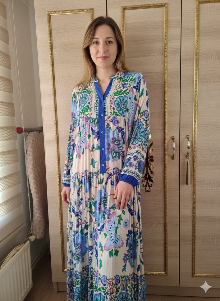 Bohem tarzda, çok renkli tie-dye desenli uzun piliseli elbise. Uzun kollu ve V yaka, yumuşak dokulu kumaştan, günlük kullanıma uygun.
