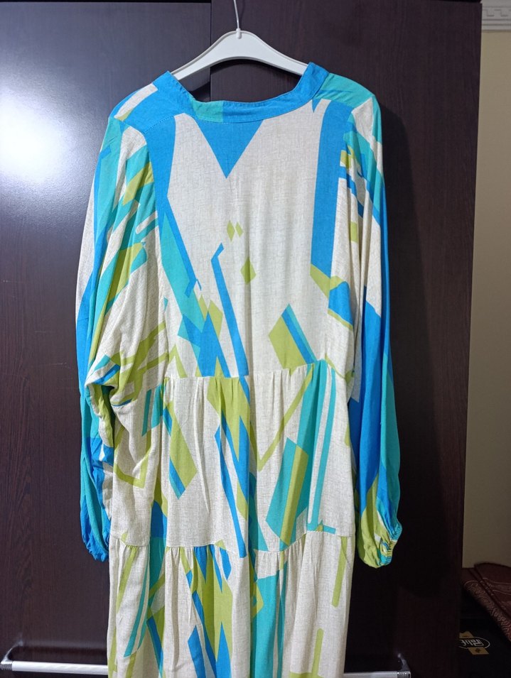 Uzun, salaş kesim elbise, uzun kollu ve V yakalıdır. Pastel tonlarda çok renkli batik desenli, dökümlü tasarıma sahiptir ve yumuşak sentetik kumaştan üretilmiştir.