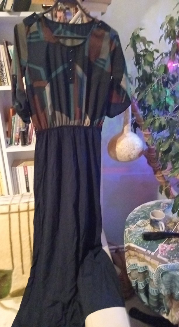 Bohem tarzda, salaş kesim, çok renkli batik desenli uzun elbise. Askılı kolları ve yuvarlak yakası vardır, yumuşak sentetik kumaştan yapılmıştır. Yirtmaci bir yanına ben açtım isterseniz tekrar dikilebilir.Yurtdisindan Ust kısmı ipek saten dokulu %100 viscon