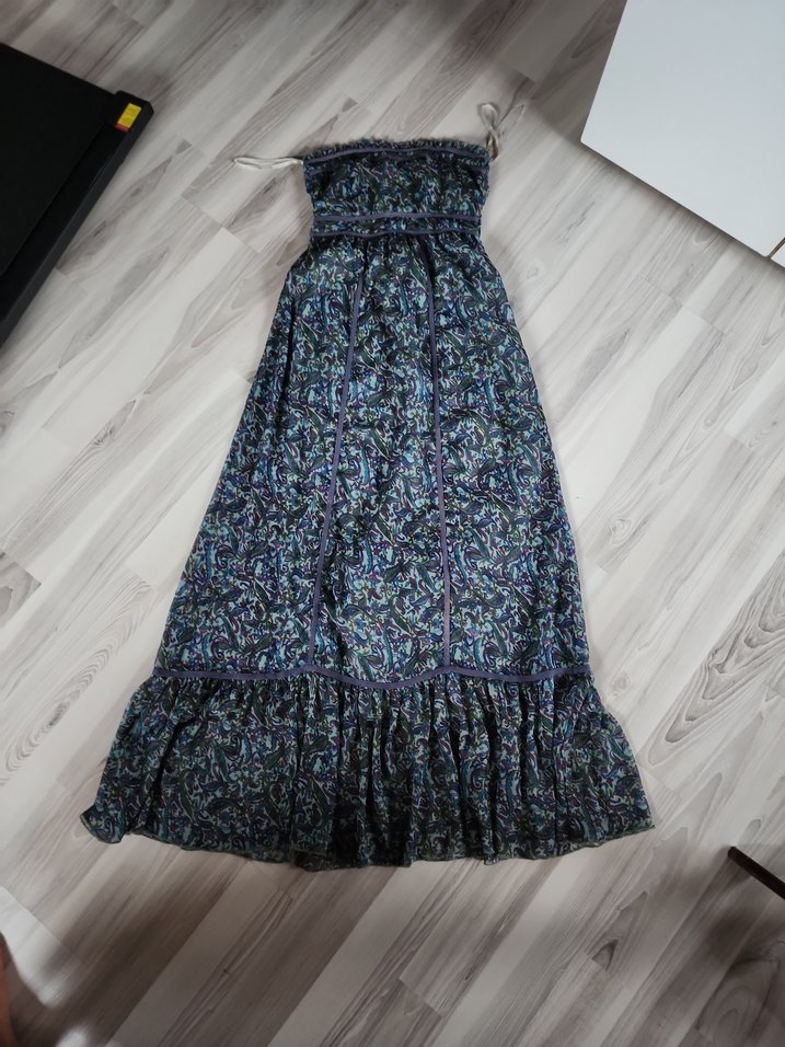 Bohem tarzda,straplez yakalı, bol kesim uzun elbise. Çok renkli koyu tonlarda batik desenli, fırfır detaylı,göğüs 36 bel 32 kol altından boyu 14 cmdir esnet lastikli straplez elbise