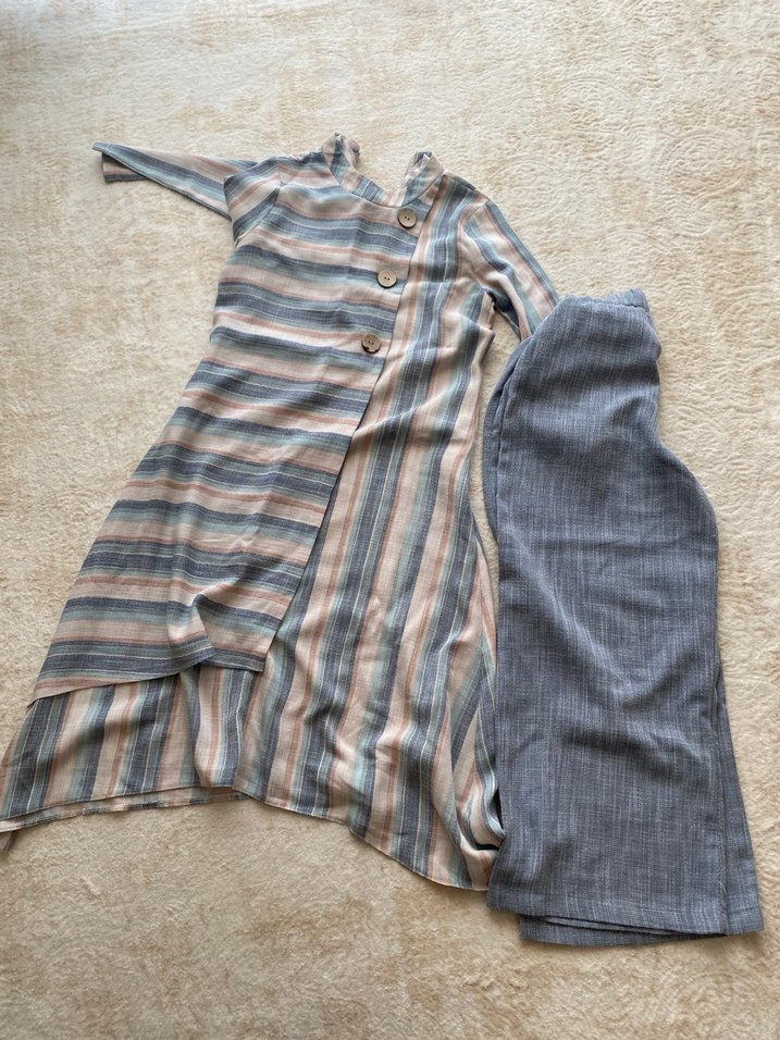 Uzun, bol kesim tesettür tunik takım, drapeli tasarım, tekne yaka ve uzun kollu. Yumuşak keten kumaştan, çok renkli batik deseniyle günlük kullanıma uygun bohem tarzda. 36-38 beden