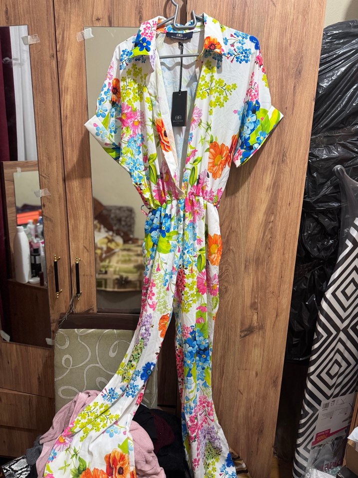 Bohem tarzda, bol kesim ve drapeli, V yakalı uzun tulum. Kısa kollu, canlı çok renkli tie-dye çiçek desenli, hafif sentetik kumaştan, sokak modasına uygun.