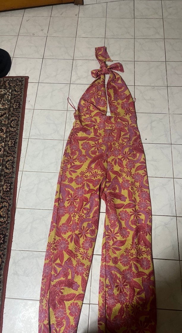 Bu bohem tarzı uzun tulum, drapeli halter yakası ve pastel tonlarda tie-dye deseniyle parti için uygun.