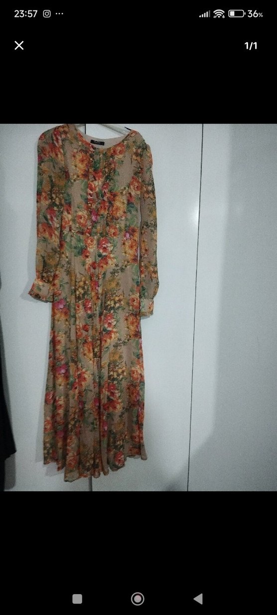Bohem tarzda, bol kesim, uzun kollu ve drapeli çok renkli çiçek desenli uzun elbise. Yumuşak sentetik kumaştan, V yakalı, günlük kullanım için uygun.