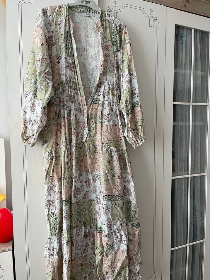 Bohem tarzda, bol kesim uzun elbise. V yakalı ve uzun kollu, pastel çok renkli batik desenli yumuşak kumaştan yapılmıştır. Günlük kullanıma uygundur.