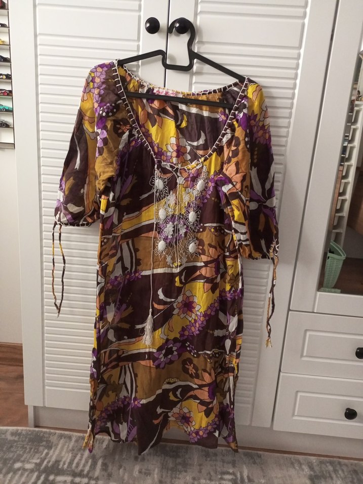Bohem tarzda, V yakalı, askılı kollu, bol kesim ve dökümlü uzun tunik. Koyu çok renkli batik desenli, yumuşak sentetik kumaştan yapılmıştır. iki kol arası 50 cm boy 94