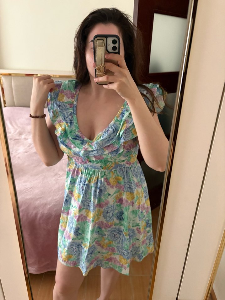 Bohem tarzı, V yakalı ve kısa kollu, bol kesim midi elbise. Yumuşak sentetik kumaştan, pastel çok renkli batik desenli ve volan detaylı, günlük kullanıma uygun. Daha önce giyilmedi sadece etiketi yoktur.