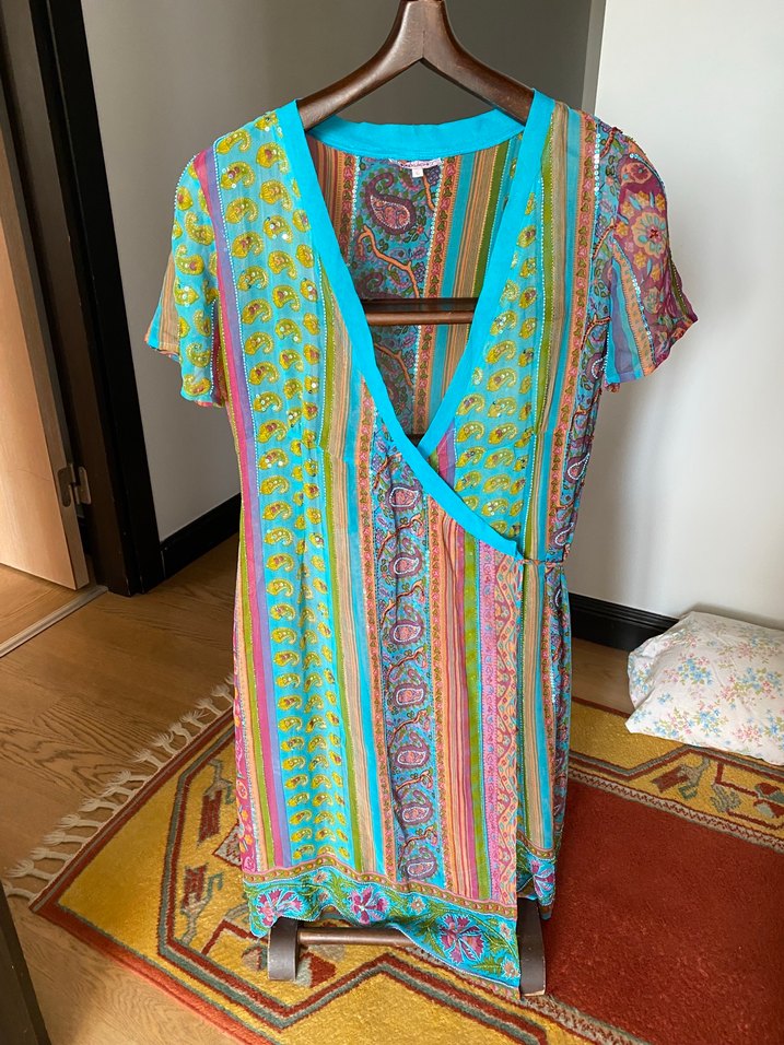 Bohem tarzı, salaş kesim ve drapeli detaylı pareo Kısa kollu, V yakalı, canlı pastel çok renkli desenlere sahip yumuşak kumaş. İpek. Boy 110 cm iki kol arası 50 cm