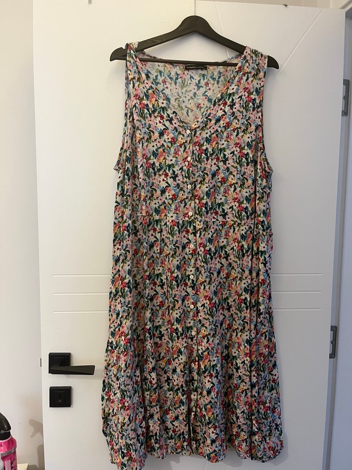 Aldıktan sonra farkettim defosu varmış ikinci fotoğrafta görüldüğü gibi ters dikilmiş. Kolsuz, V yaka, bol kesim ve salaş drapeli bohem elbise. Hafif çok renkli batik desenli, midi boyda rahat bir tasarım.