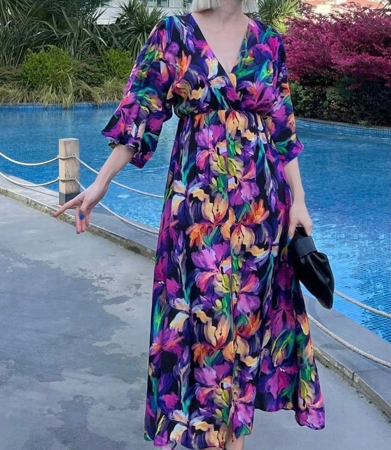 Bohem tarzda, mor renkli tie-dye desenli, V yakalı ve kısa kollu uzun elbisesi. İnce, hafif transparan ve ipeksi dokuda, günlük kullanım için uygundur.