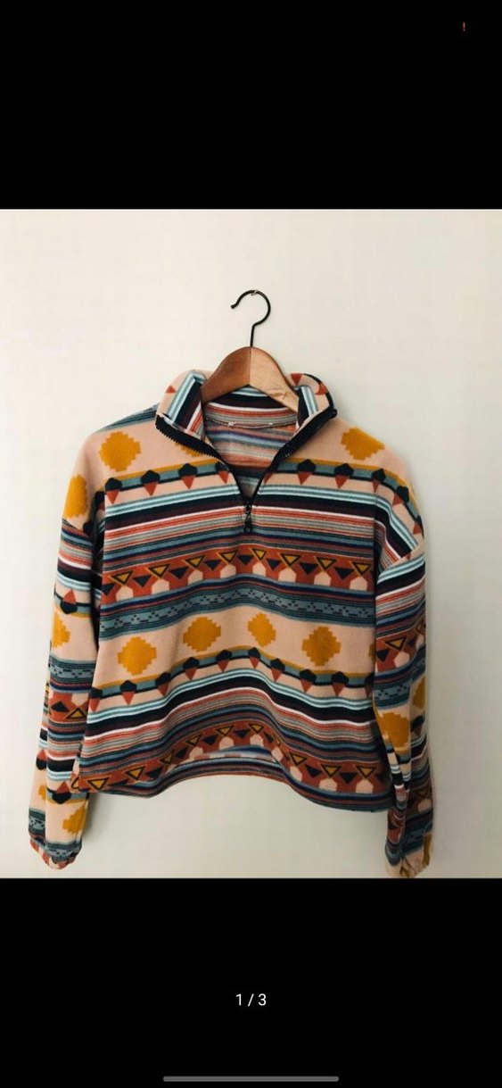 Bohem tarzda, yüksek yakalı ve uzun kollu, bol kesim çok renkli desenli örme sweatshirt. Günlük kullanım için uygundur. temiz kullanılmıştır