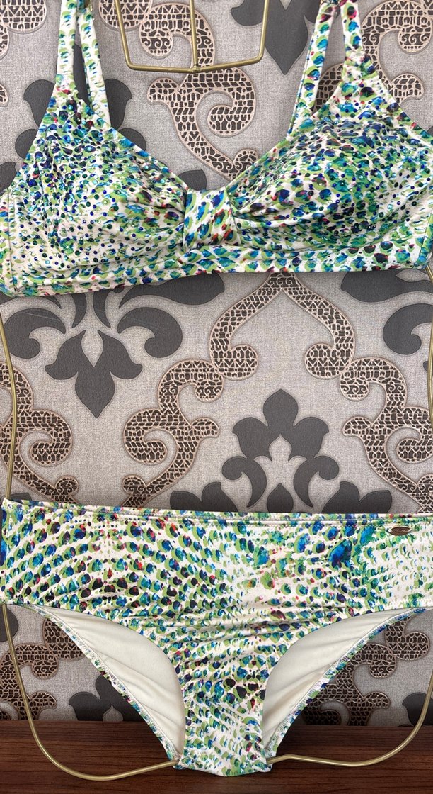 Bohem tarzda, çok renkli yılan desenli, askılı ve vücuda oturan bikini. Plaj kullanımı için uygun, baskılı ve retro havası var.