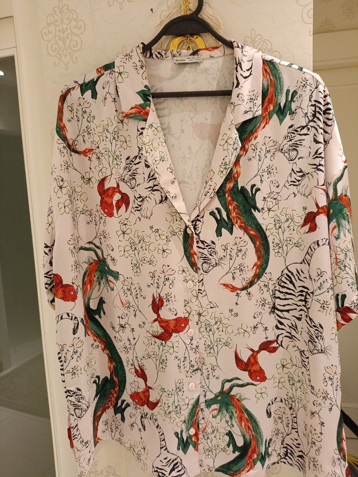 Saten kumaştan, bol kesim, çok renkli yılan desenli, V yakalı ve düğmeli bohem tarz gömlek. Kısa kollu ve midi boyda, rahat kullanıma uygun.