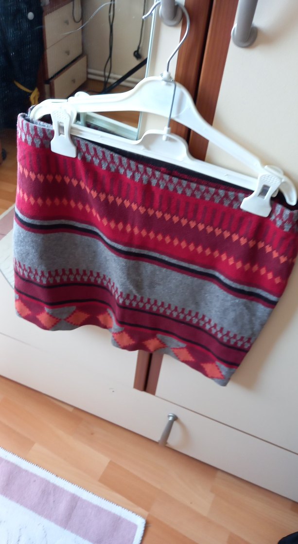 Bohem tarzda, çok renkli desenlere sahip, örgü dokulu, bol kesim mini etek. Günlük kullanıma uygundur.