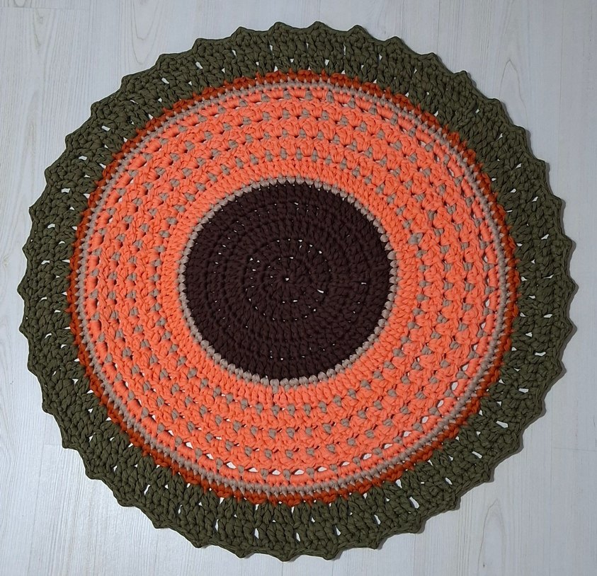 Bohem tarzda, koyu tonlarda çok renkli iplikten örülmüş yuvarlak halı. Dokulu yüzeyi mekâna sıcaklık katar. 85×85cm