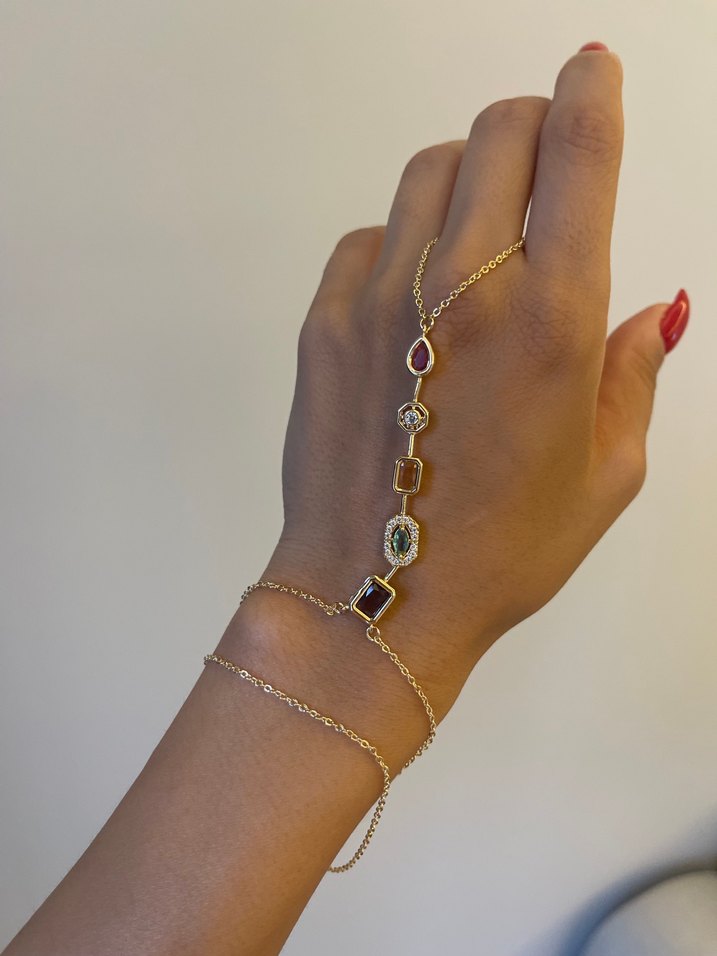 Bohem tarzda, çok renkli taşlar ve zarif altın zincirlerle detaylandırılmış kadın el zinciri. Günlük kullanıma uygun, şık ve göz alıcı.
