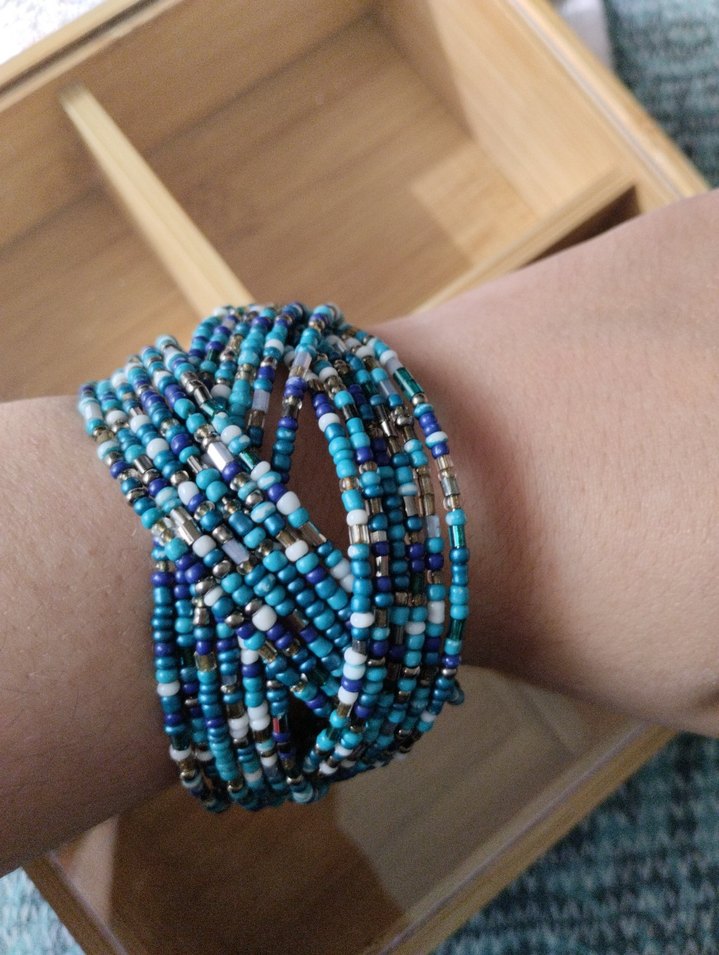 Bohem tarzda çoklu turkuaz boncuklu bileklik, renkli batik desenlere sahiptir. Günlük kullanıma uygundur.