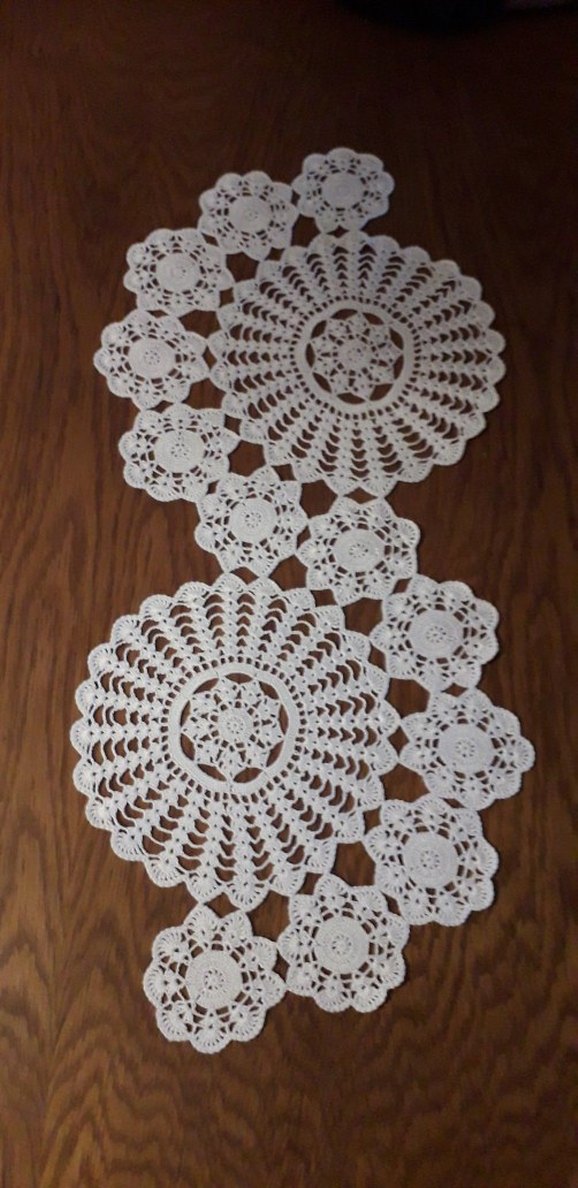 Bohem tarzda el yapımı dantel sehpa örtüsü, ince işçilikle hazırlanmış yuvarlak desenler içerir, dekorunuza nostaljik bir hava katar.