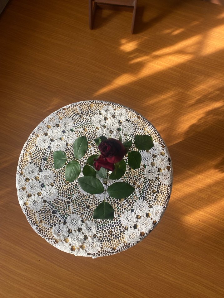 Çiçek desenli, yuvarlak bohem dantel masa örtüsü. Ahşap yüzeylere zarif bir dokunuş katıyor.