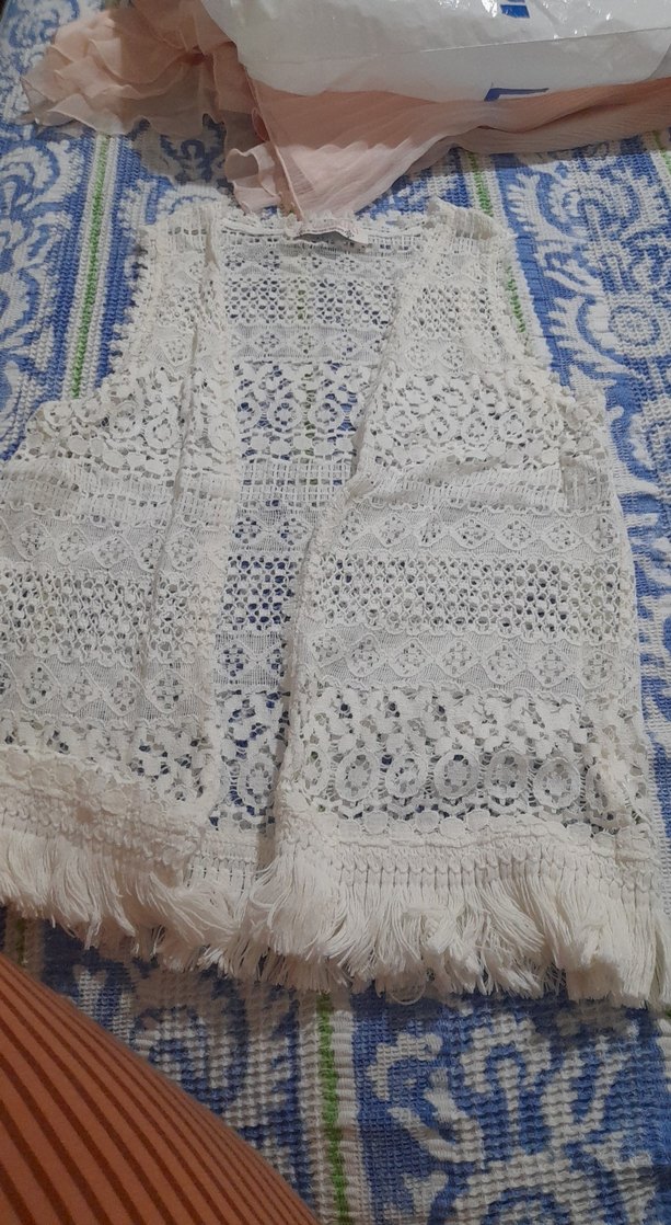 Dantel detaylı beyaz örme kadın şal, püskül süslemeli, bohem tarzda, hafif ve ferah bir tasarım sunar.