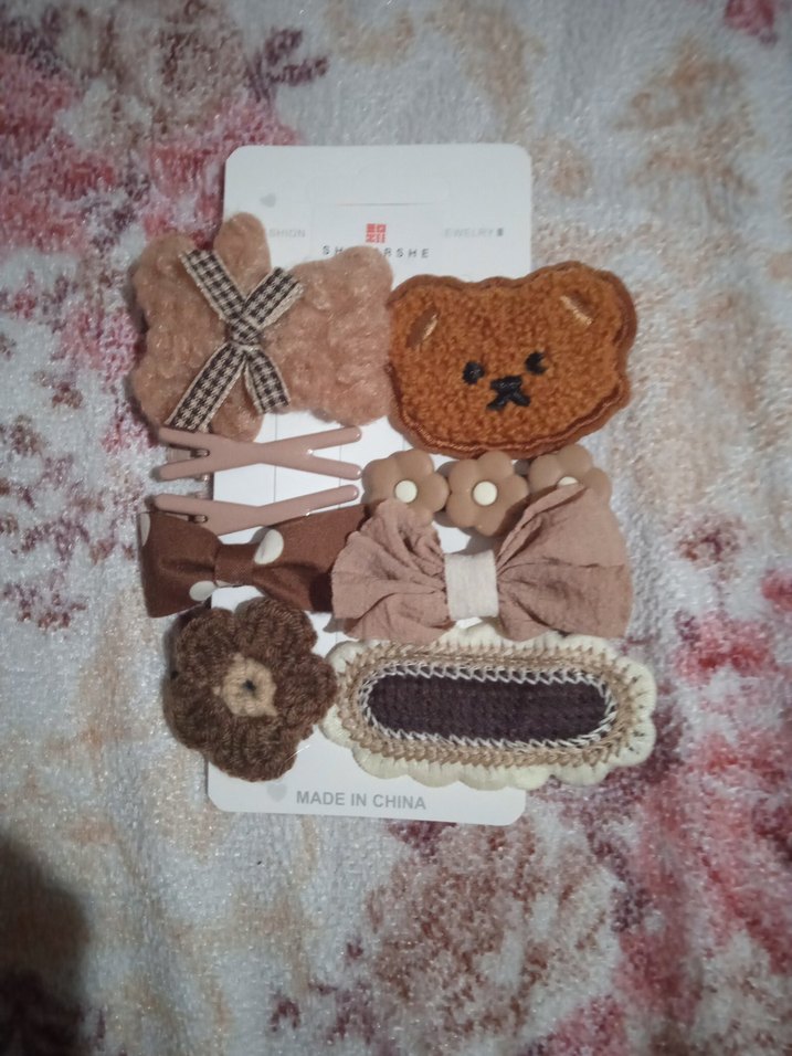 Bohem tarzda, dantel ve nakış detaylı pastel kahverengi çocuk saç tokası seti. Fiyonk, çiçek ve ayı şekilli tasarımlar içerir.