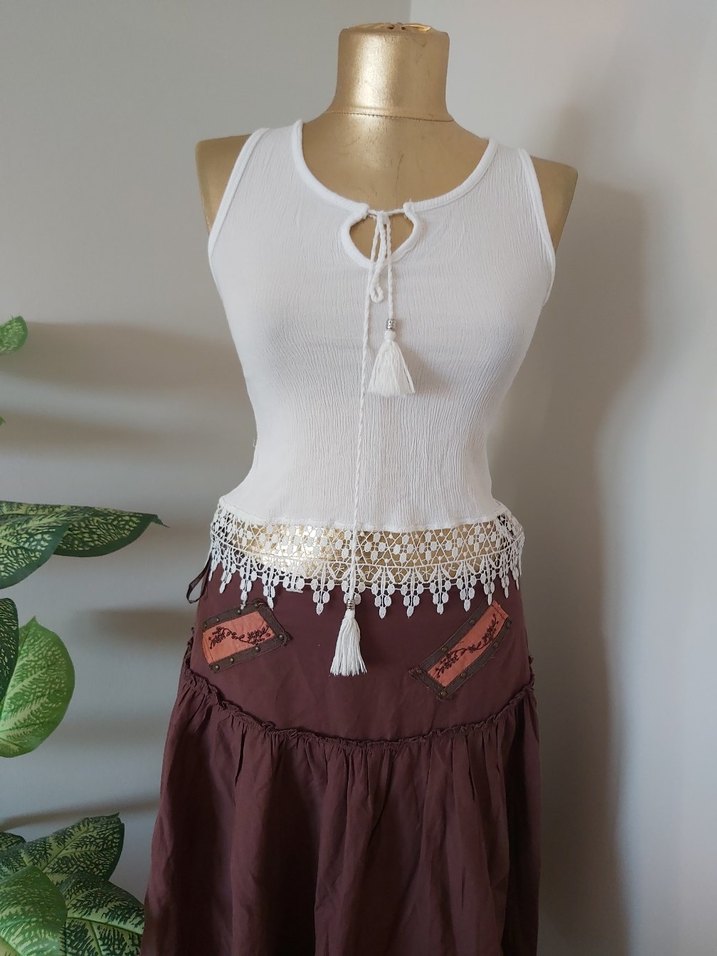 Bohem tarzda, beyaz renk, püsküllü detaylarai, günlük kullanım için uygundur.