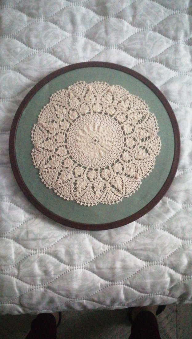 Bohem tarzda dairesel desenli ince dantel işlemeli, koyu ahşap çerçeveli dekoratif ürün.