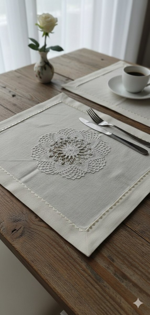 El yapımı keten örtü, bohem tarzda beyaz dantel işlemeleriyle süslenmiş, detaylı çiçek desenleri ve zarif işçilik içerir. 6 adet supla takımı