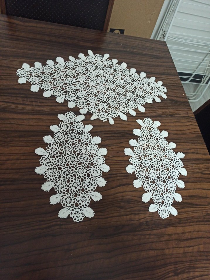 Bohem tarzda, çiçek ve yaprak desenli beyaz dantel tepsi örtüsü seti, üç parçadan oluşmaktadır.