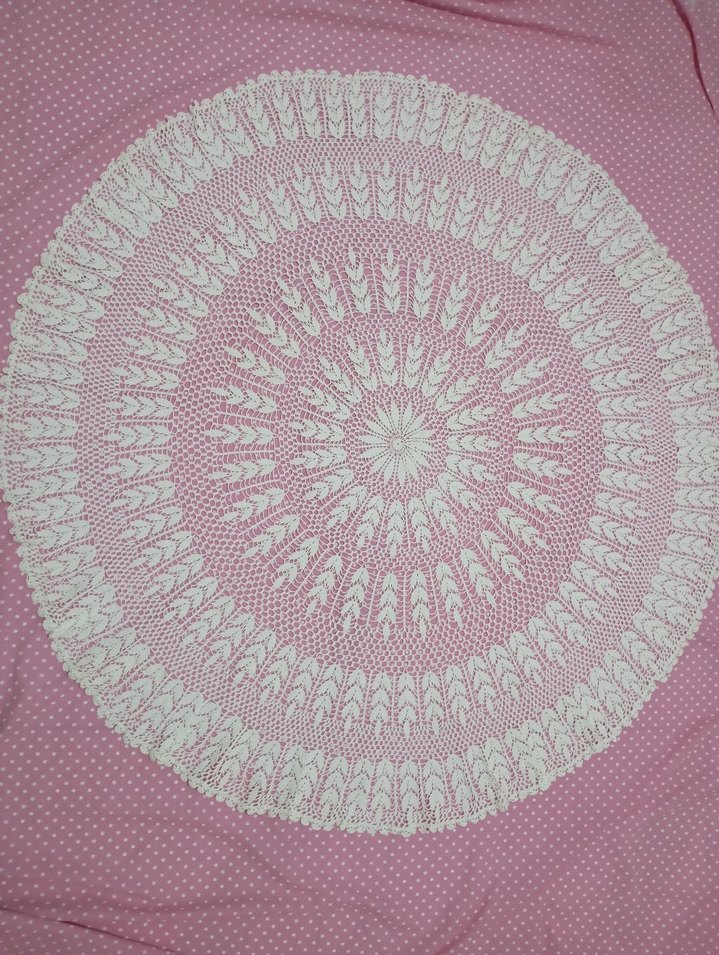 Bohem tarzda, pembe puantiyeli kumaş üzerinde beyaz dantel işlemeli yuvarlak masa örtüsü, zarif bir görünüm sağlar.