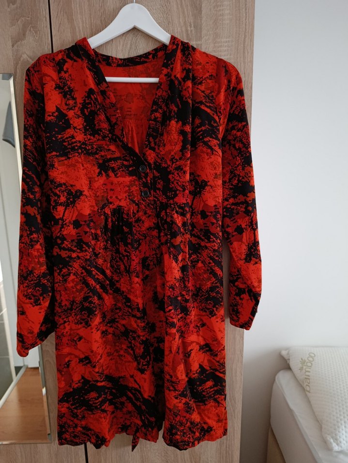 Bohem tarzda, kırmızı-siyah bağlama desenli, uzun kollu, V yakalı, düğmeli, dökümlü hamile elbise. Yumuşak dokulu kumaştan, midi boy, günlük kullanım için uygun. 42-44 bedene kadar giyime uygundur.